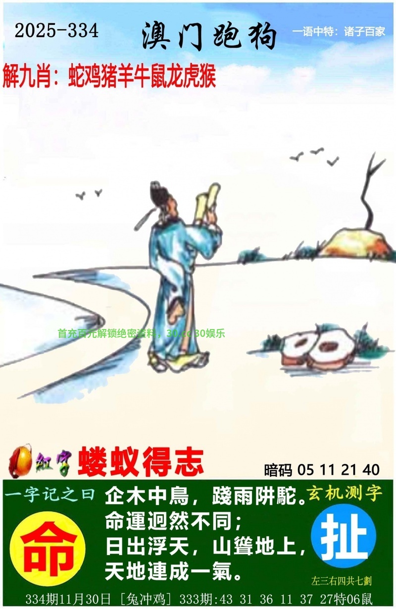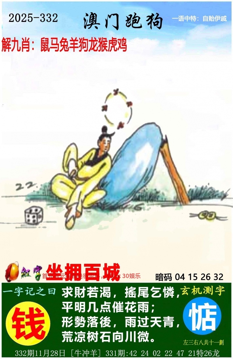 336期一字記之曰:【姚】金銀財足:摇頭擺尾,玩世不恭。半空回首晨鸡弄。形影相吊,依然自在。冠带郎君颜貌古。玄機測字:《玩》 解:摇頭擺尾,小肖:鼠兔龙蛇猴鸡。 综合取肖:鼠兔龙蛇猴鸡 ![]() |